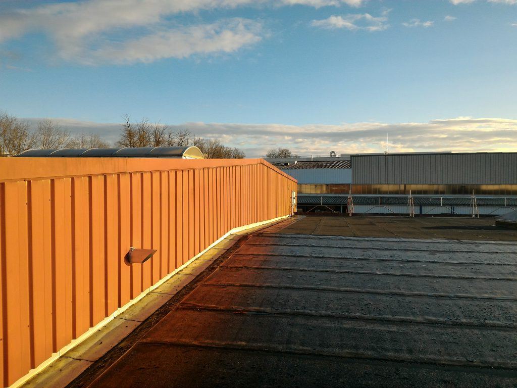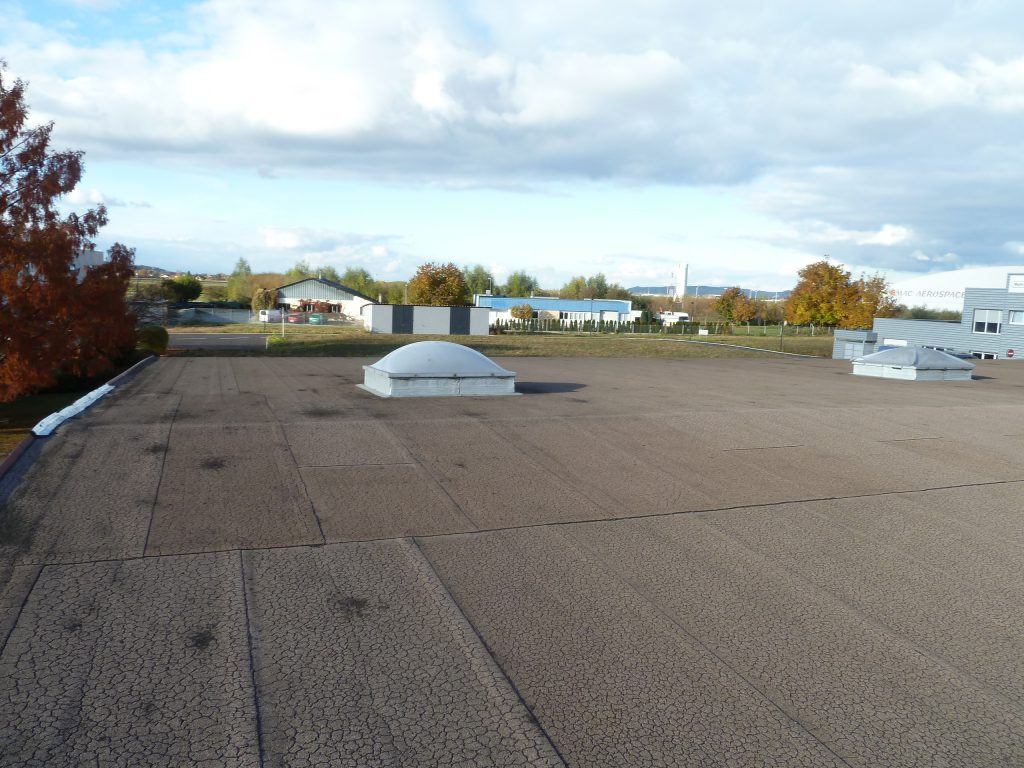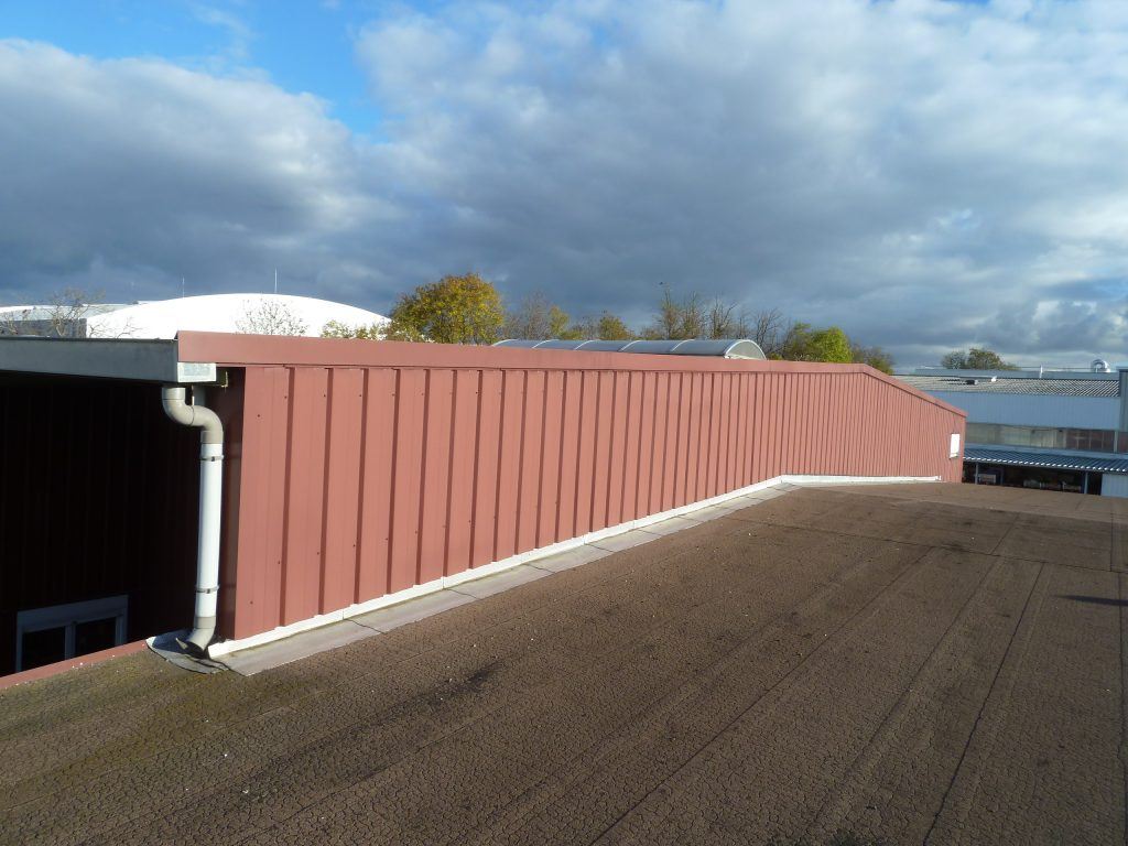 Réfection d’étanchéité par chape bitume ardoisée auto-protégée et mise en œuvre de bardage horizontal identique à celui posé par nos soins en 2013 sur l’extension (nouveau bâtiment).