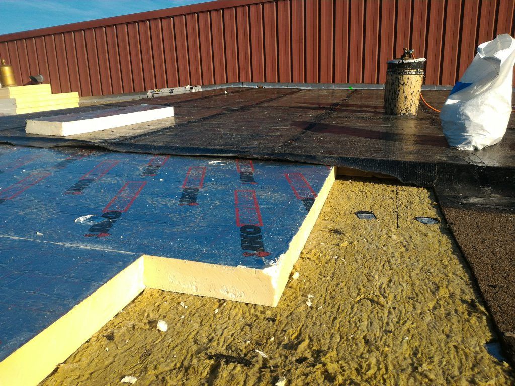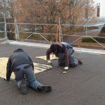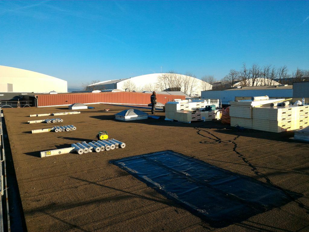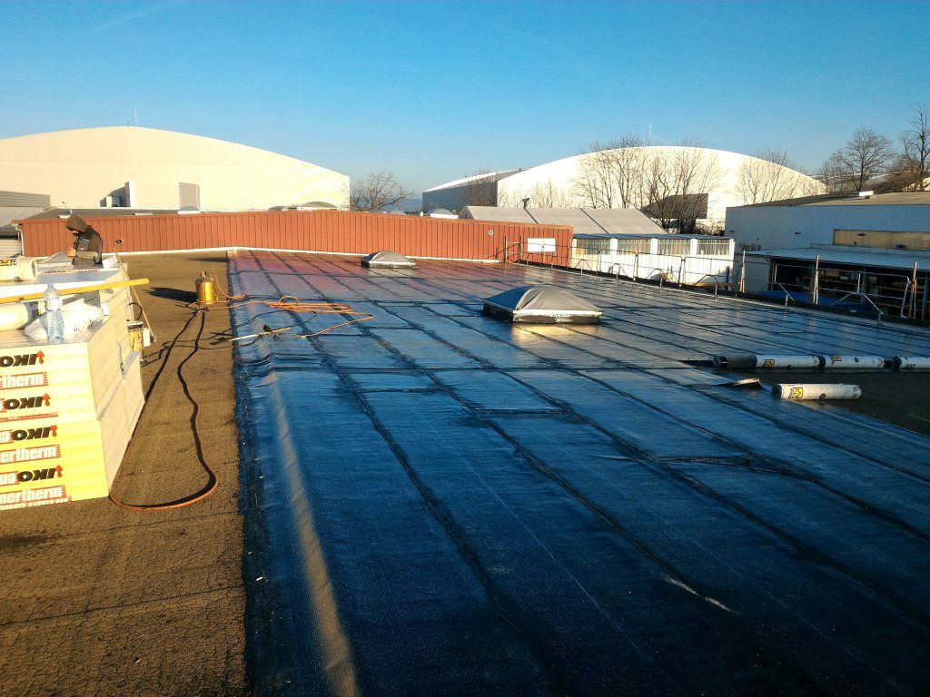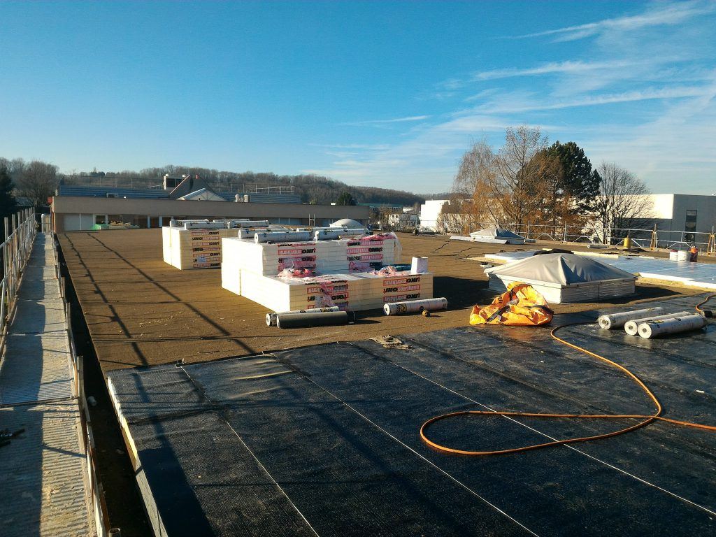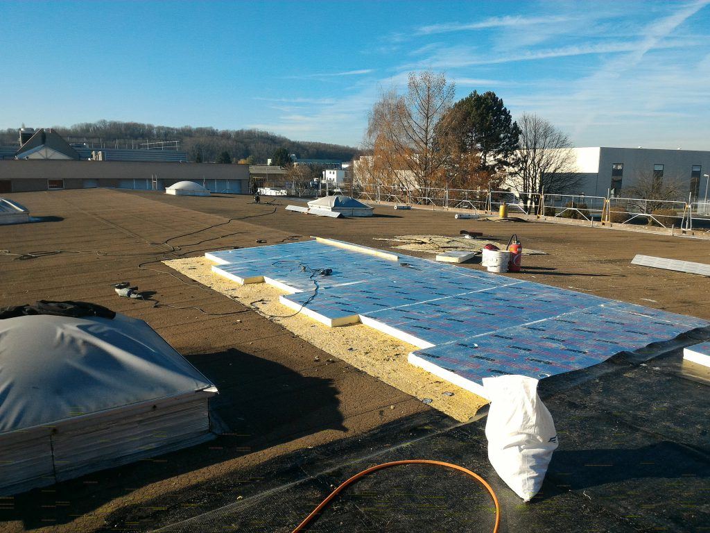 Il avait été initialement envisagé la pose d’un nouvel isolant et un revêtement d’étanchéité sur l’ancien complexe conservé, mais la surcharge ne pouvait être admise par la structure. En collaboration avec l’architecte, nous avons choisi de retirer l’ancien revêtement en conservant son isolant, de renforcer l’isolation avec des panneaux de mousse de polyuréthane de 80mm d’épaisseur et de poser un nouveau complexe d’étanchéité fortement armé et fixé mécaniquement type MEGAFIX et MEPS 3000AR SPP.
