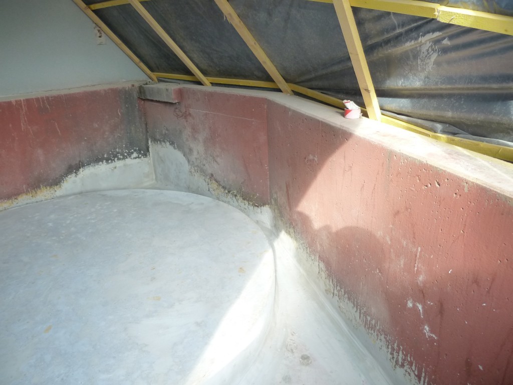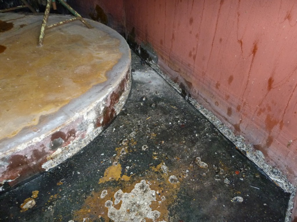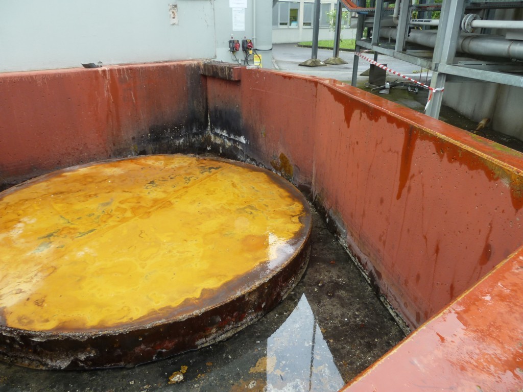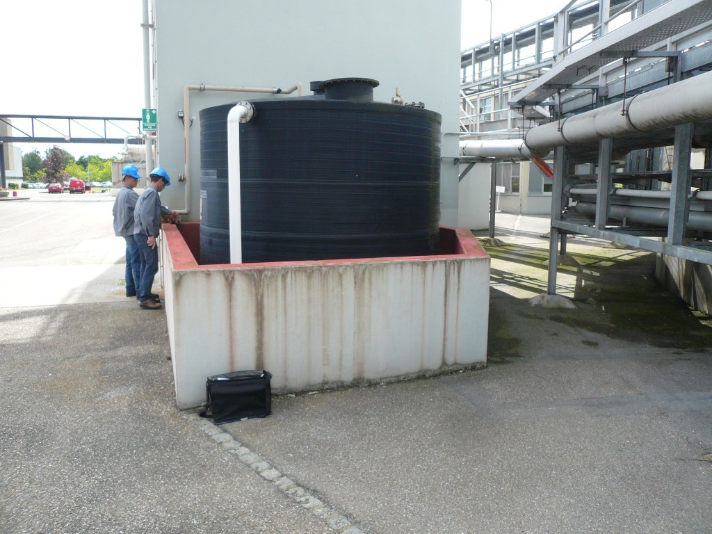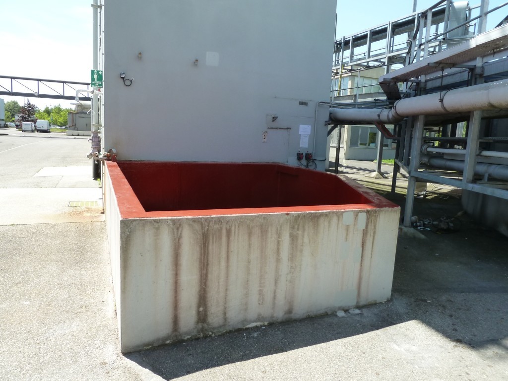 Dans la zone de traitement des eaux polluées, une cuve d’acide doit être remplacée. Elle est placée dans un « bac de rétention » en béton armé, présentant des dégradations très importantes : désagrégation des bétons en bas de cuves (zone immergée) d’environ 60% de l’épaisseur des murs. Il faut dépolluer les ouvrages (acidité ph zéro), reconstituer les bétons, et les protéger par un revêtement spécial qui résiste aux acides les plus agressifs.