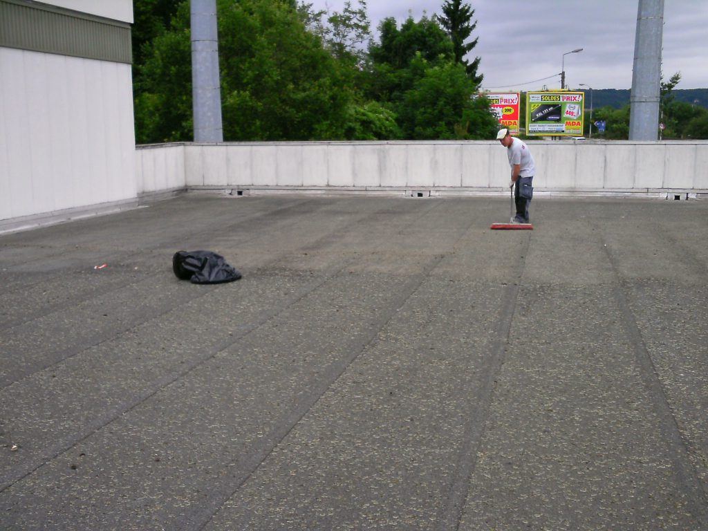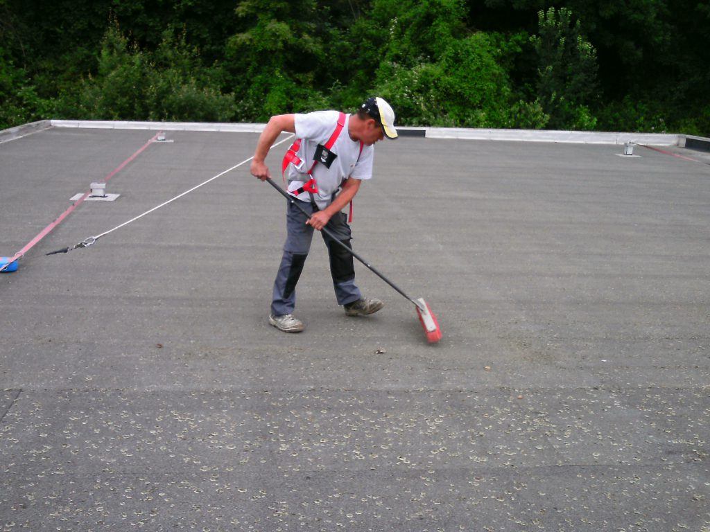 Nettoyage soigné, démoussage, pulvérisation d’un agent algicide fongicide préventif et réparation ponctuelle d’étanchéité par chapes bitumes soudées au chalumeau.